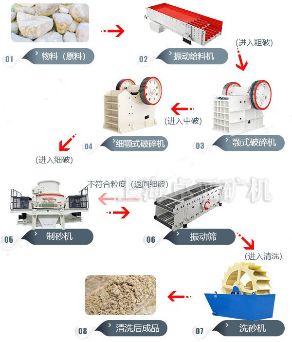 一般砂石廠的生產流程為料倉——給料——破碎——製砂(shā)(整(zhěng)形)——篩分——洗砂——砂石成品,各流程間(jiān)由輸送機(jī)連接,因(yīn)此砂石(shí)廠需要的生產設備主要包(bāo)括